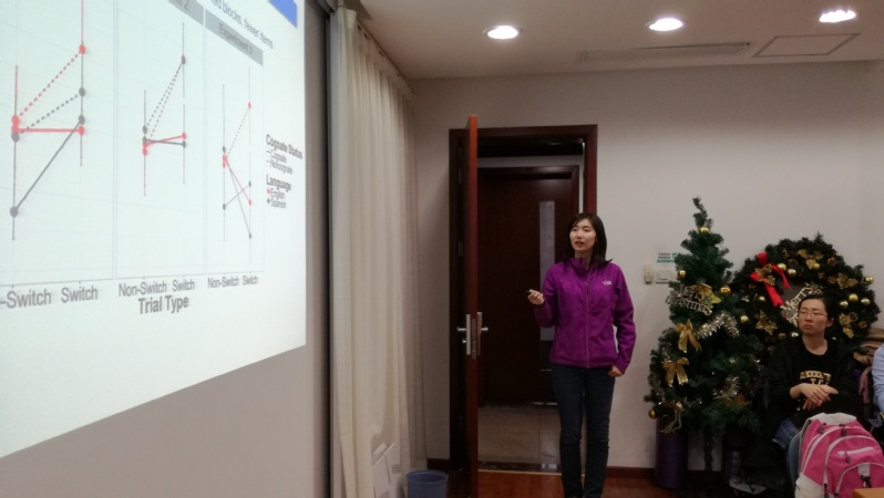 Dr. Li Chuchu, who is currently a postdoc research fellow from University of California San Diego (UCSD), was invited to give a talk in the Center for Modern Language Studies at School of Foreign Studies, Shanghai University of Finance and Economics on April 20th from 6pm to 8pm in Room 426, Red Tile Building. She delivered a lecture entitled “Does Coffee Facilitate Language Switching?”.